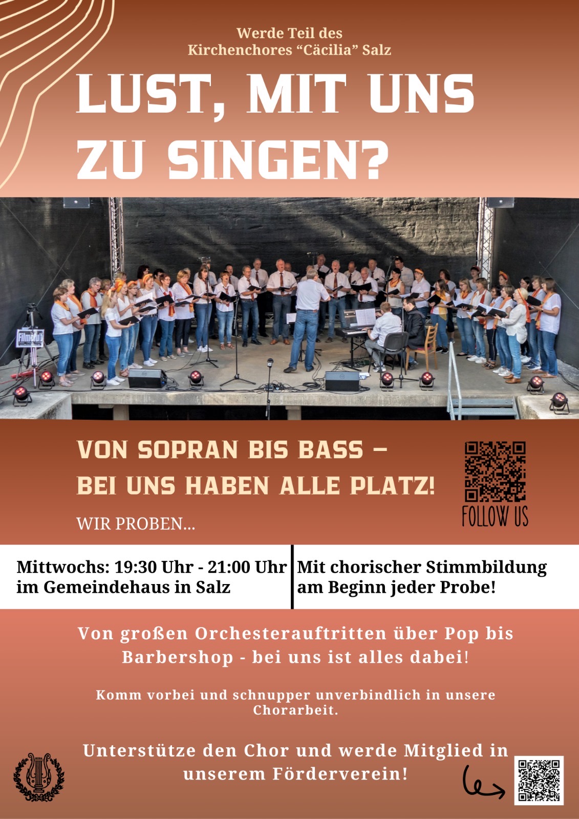 Herzlich Willkommen! Schön, dass du uns gefunden hast. Der Katholische Kirchenchor Cäcilia Salz zählt zu den ältesten Kirchenchören des Bistums Limburg. Überwiegend widmet sich der Chor der Kirchenmusik, aber auch weltliche Musik und Popmusik sind Bestandteil unseres Repertoires. Jede unserer Proben beginnt mit einer knackigen professionellen Stimmbildungseinheit und dauert ca. 1,5 Stunden. Wer gerne singt und Spaß daran hat, in seiner Freizeit regelmäßig an Chorproben teilzunehmen, ist bei uns richtig. Komm einfach vorbei zu einer "Schnupper-Probe". Wir freuen uns auf dich!